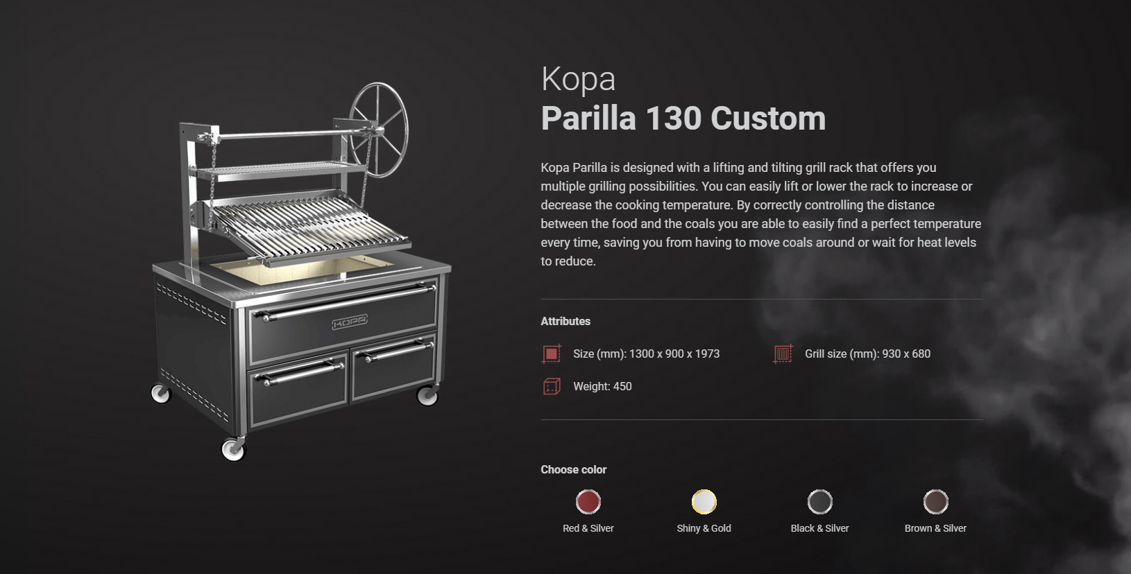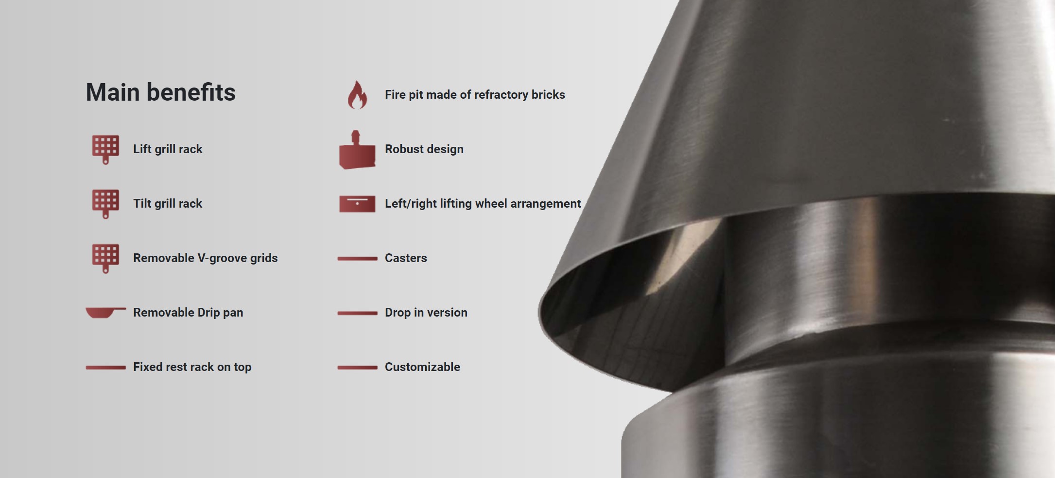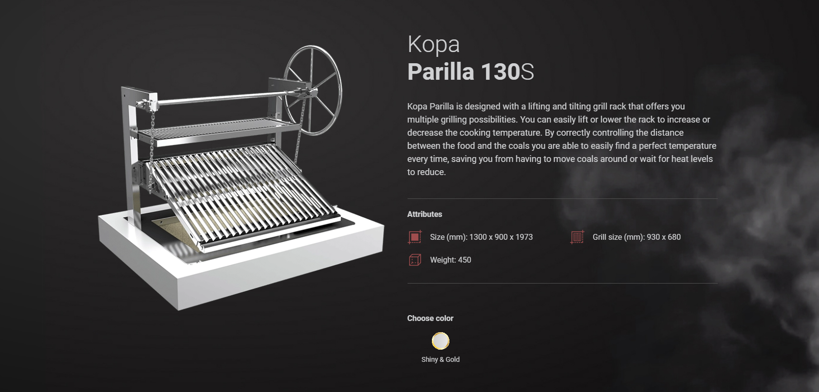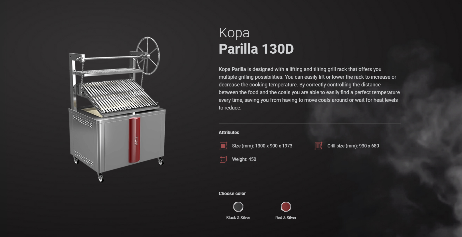 The design and appearance of the Kopa Parilla ensure that wherever you place it is bound to make a statement and draw the customers eyes to the action around it and increase sales of your grilled food. It is not just a grill it is a show maker and an entertainer all in one. Kopa Parilla is designed with a lifting and tilting grill rack that offer you multiple grilling possibilities.You can easily lift or lower the rack to increase or decrease the cooking temperature.By correctly controlling the distance between the food and the coals you are able to easily find a perfect temperature everytime,saving you from having to move coals around or wait for heat levels to reduce.Grill rack consists of removable V-grooved grill racks.The V-groove grate provides a sturdier cooking surface and more even heat distribution than typical wire-grate barbeques.The grilling surface which sits at a slight angle allows the juices that drip from the meat to run down the channel and collect in the drip pan attached to the grill rack.This design elimates most fire flare-ups.The taste of meat is purer and feel less smoky.