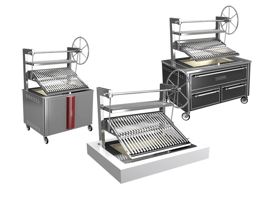 This Argentine type grill is a show maker. It will definitely cause your customer to stop, watch and take pictures. With the chaines superstructure with a large wheel to lift and lower the grilling surface it is best served in font cooking environment