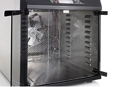 Full body interior and exterior stainless steel. 10 stainless trays, 16 square feet of drying space, 99 hour digital timer with 2-time / 2-temperature setting, front access control panel for easy setting, clear glass doors for easy viewing of drying progress, adjustable thermostat range of 95°F to 165°F, 6.5″ fan for excellent air circulation, drip tray to minimize mess. Easy to use. Included Preserve it Naturally so you can learn how to dehydrate all types of foods.