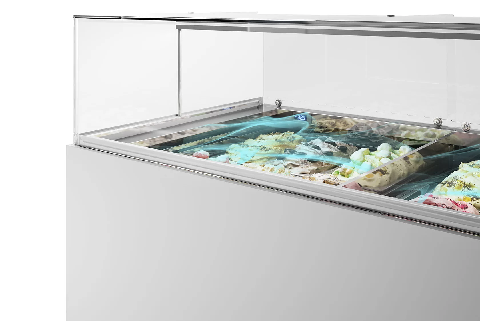 This patented technology makes it possible to differentiate temperatures – with 6 or 4 tray units – to preserve and display ice creams with various consistencies.
