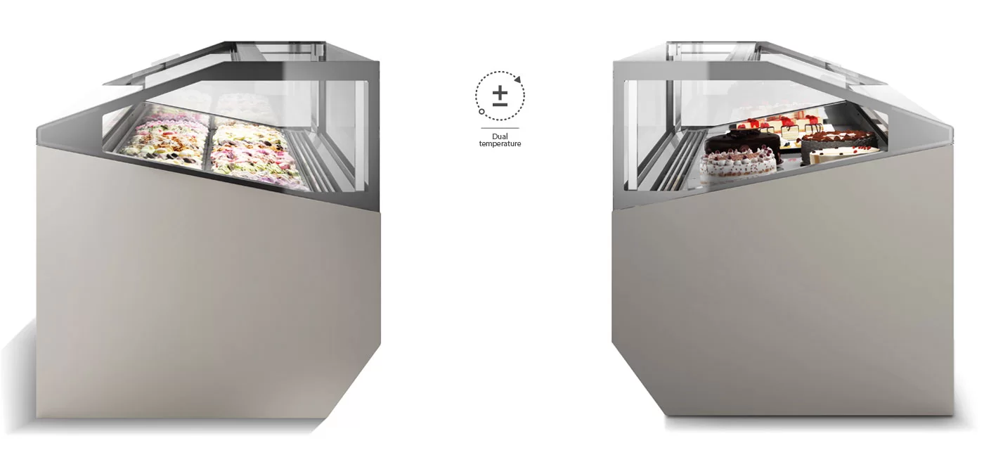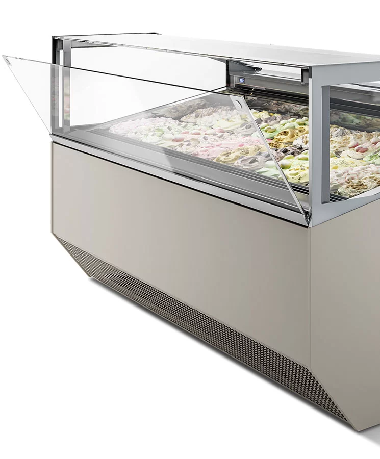 The Dual Temperature function (optional) allows one cabinet to offer seasonal flexibility without increasing floor space. In fact, the Gelato display case can easily pass from negative to positive temperature, becoming a Pastry showcase with the addition of stainless-steel trays. The system, in fact, allows to achieve ideal temperature and humidity conditions for the long exposure of fresh pastry, by just use a simple button. On request, it is also possible to apply a glass shelf and LED lighting (5700 K).