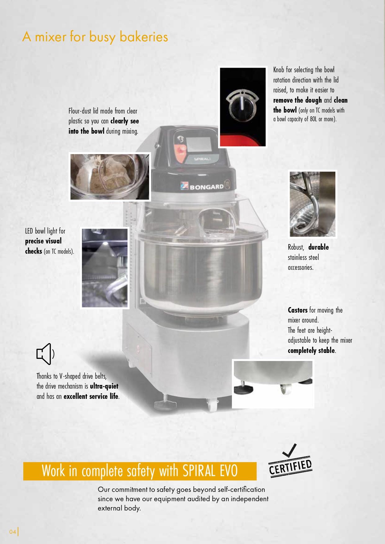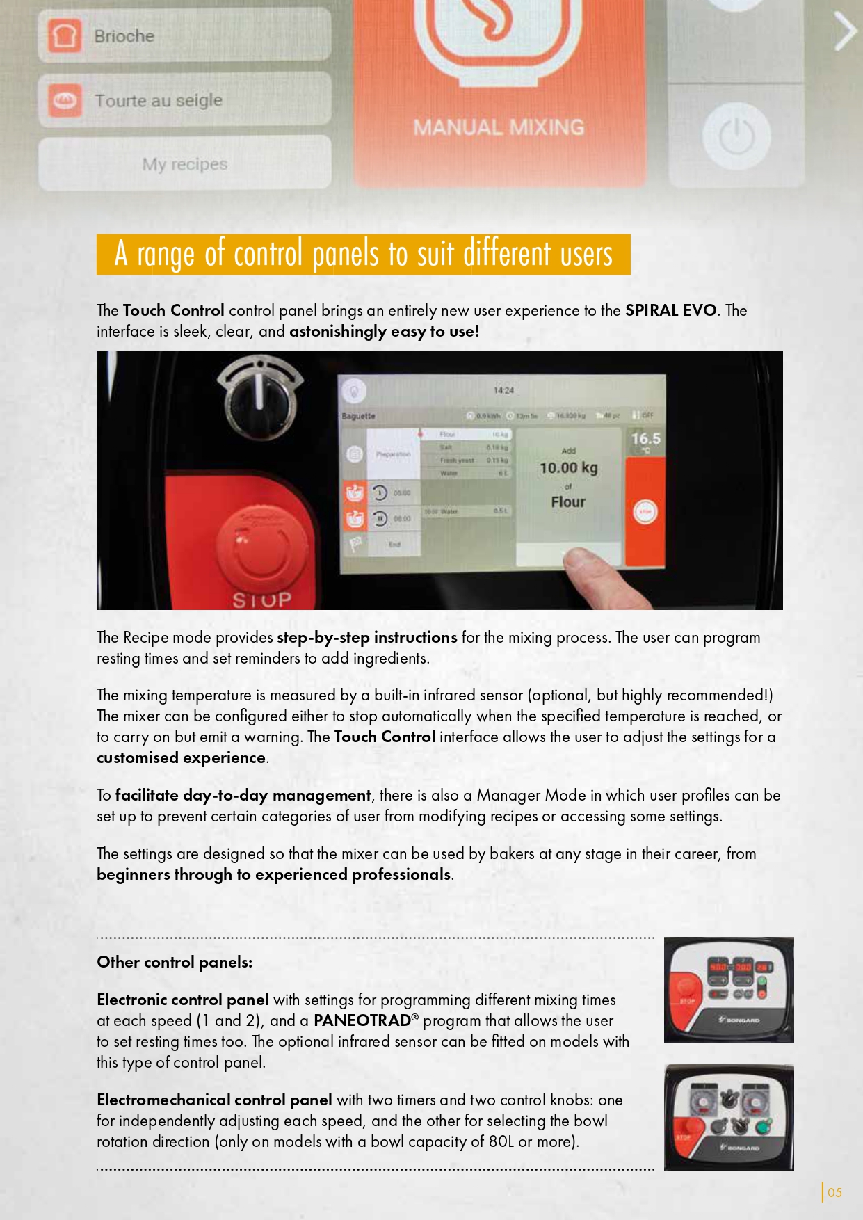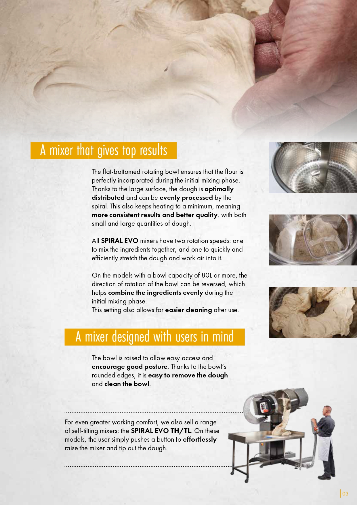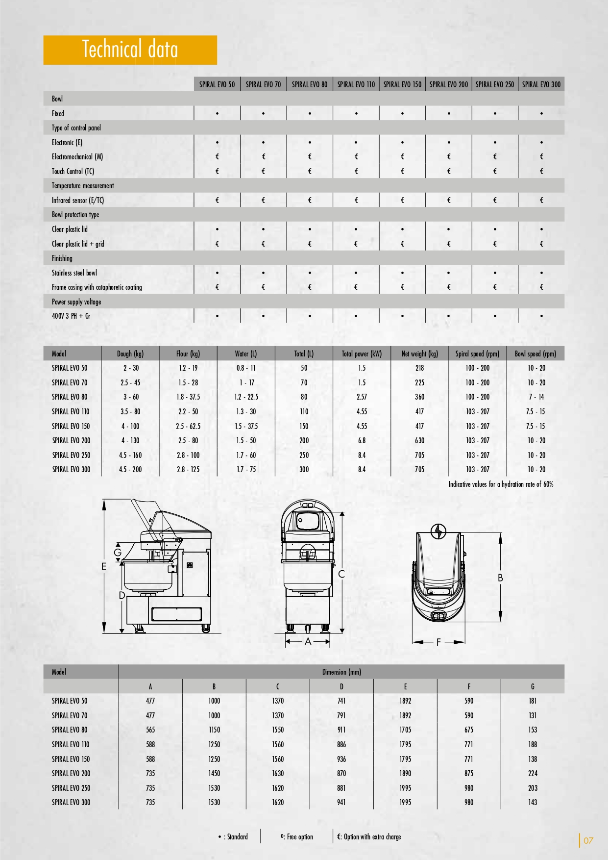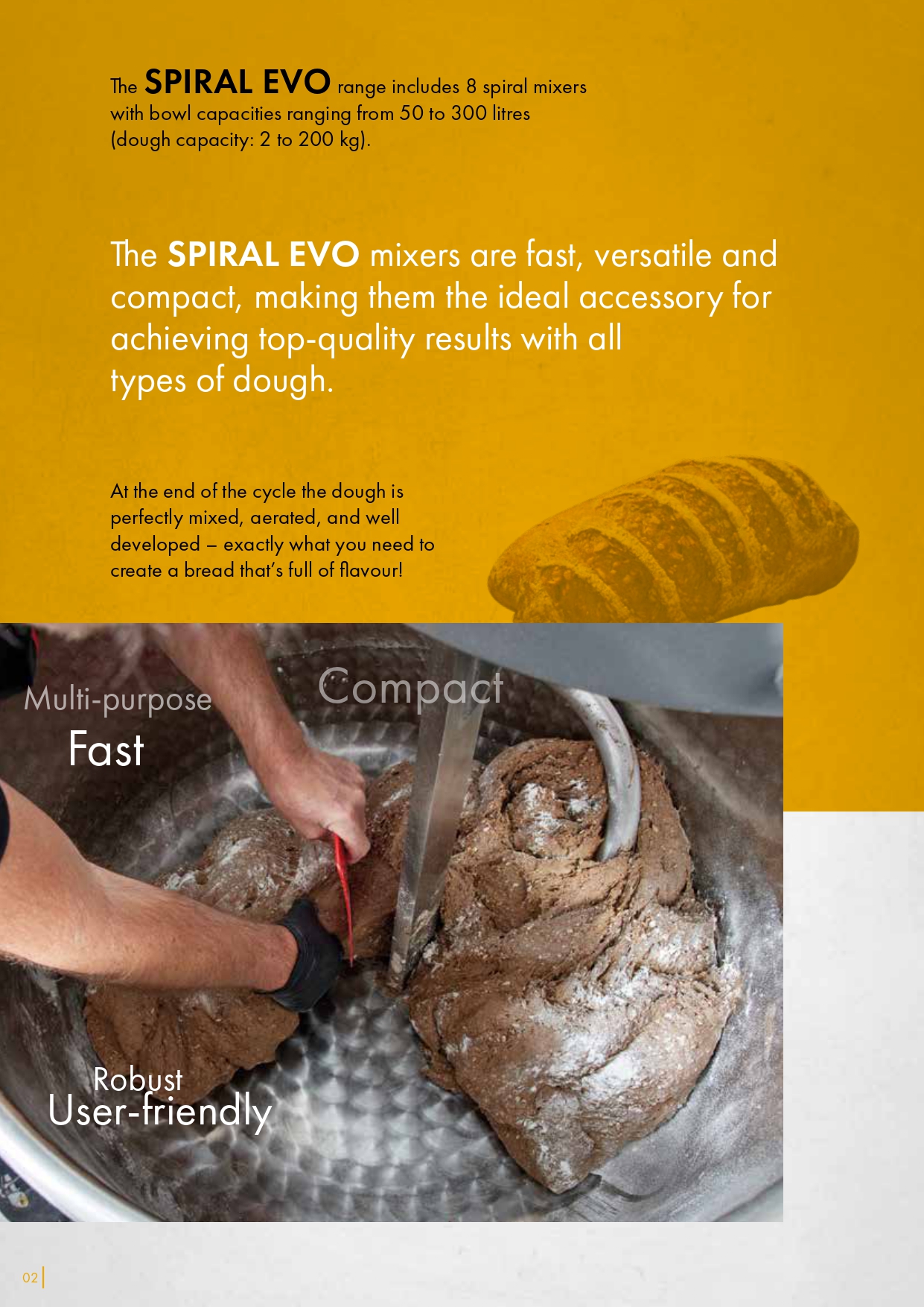 The SPIRAL EVO range includes 8 spiral mixers with bowl capacities ranging from 50 to 300 litres (dough capacity: 2 to 200 kg).The SPIRAL EVO mixers are fast, versatile and compact, making them the ideal accessory for achieving top-quality results with all types of dough.