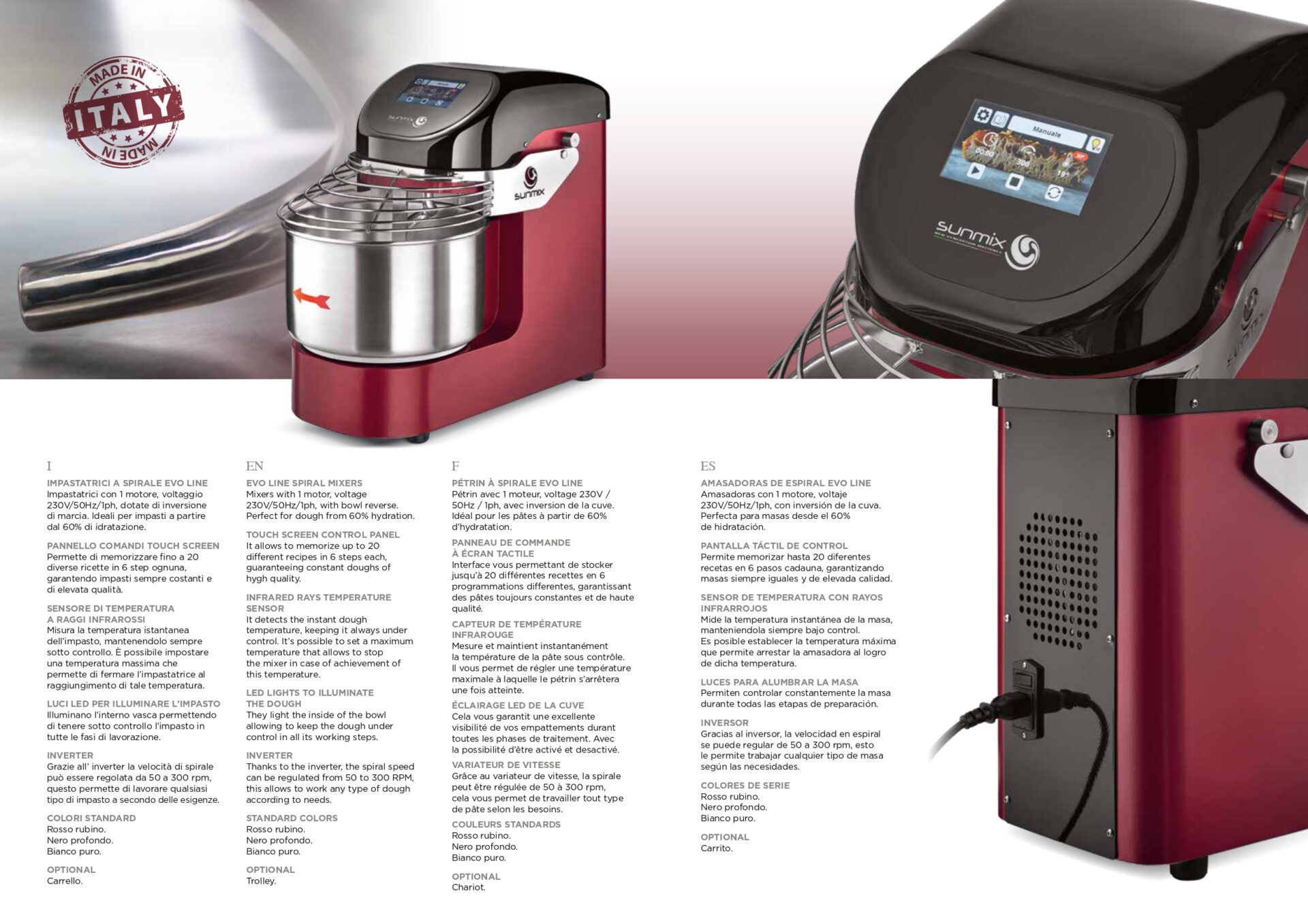 The Sunmix EVO6 mixer is the latest addition to the Sunmix family and is capable of processing up to 6 kg of dough at speeds ranging from 70 to 300 revolutions per minute. It is equipped with: