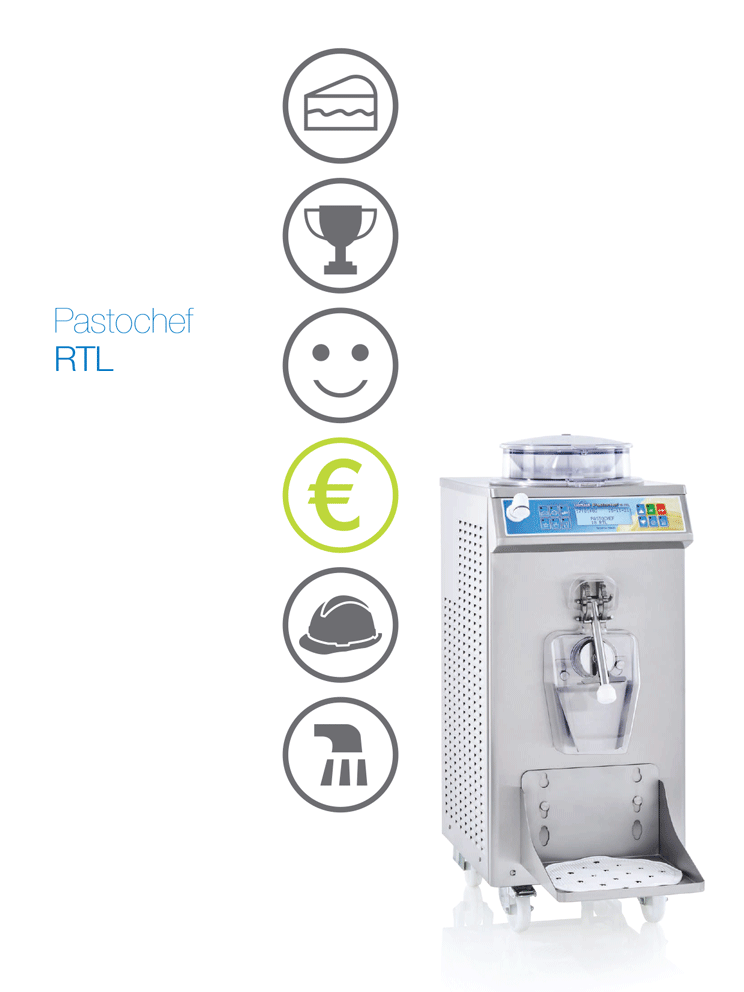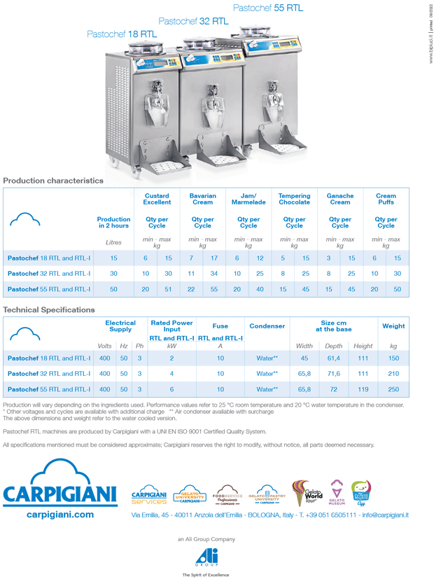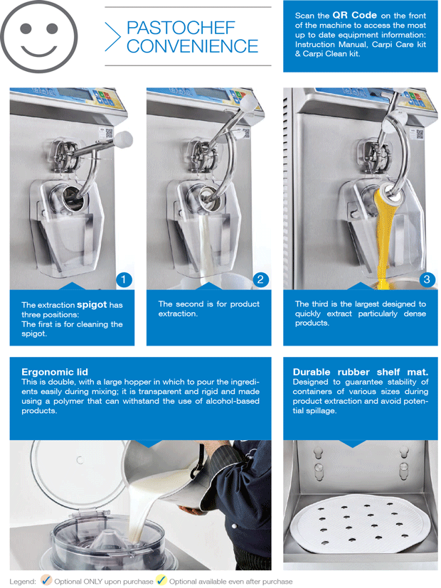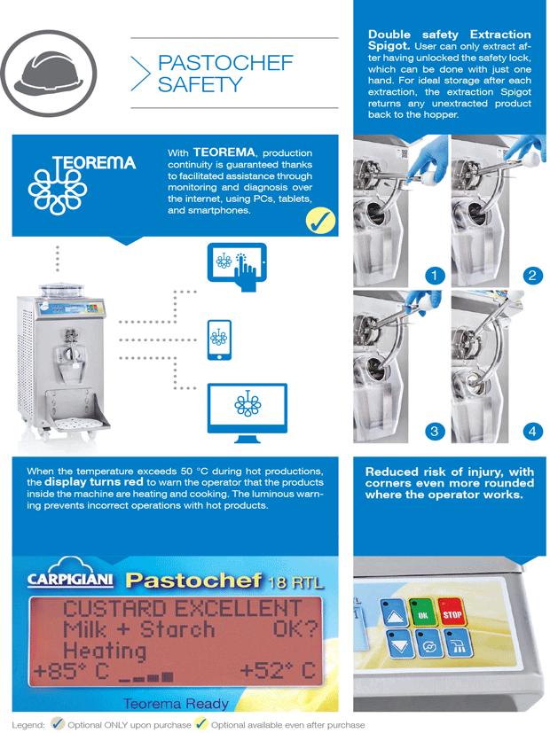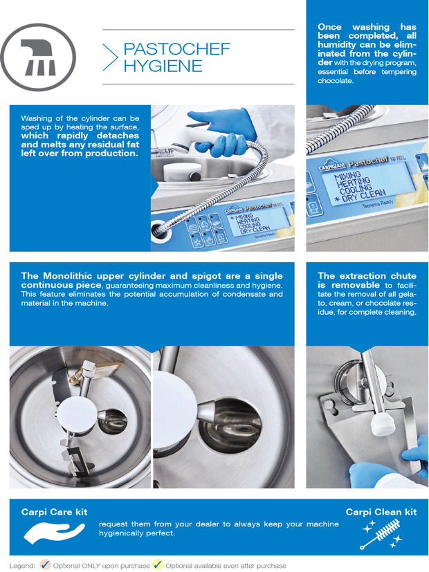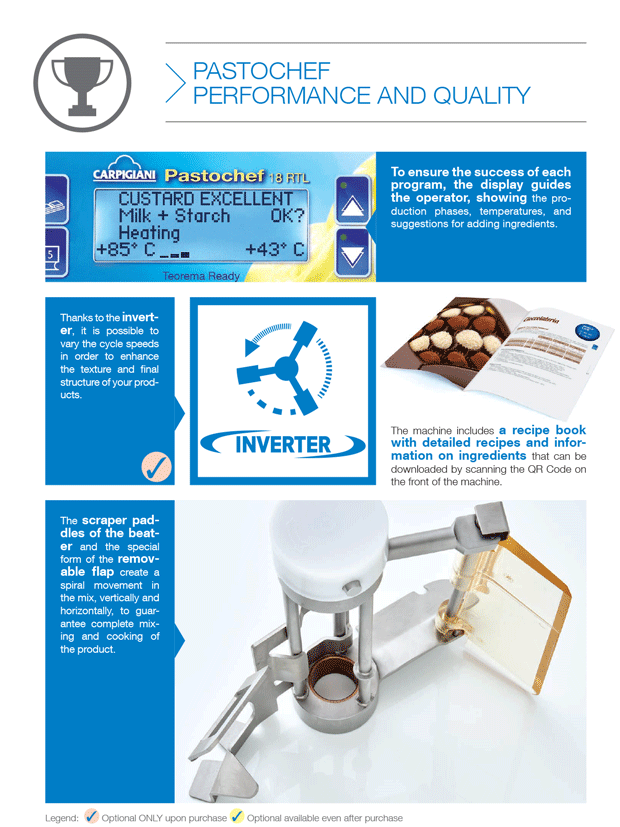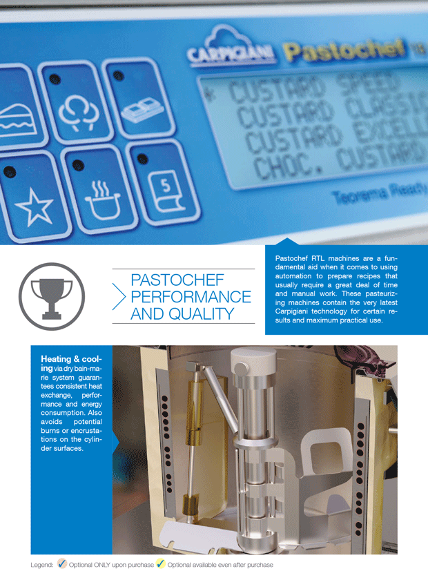Carpigiani. Pastochef Multifunction machine สำหรับ ทำขนม, ช็อคโกแลต, แยม, ครีม, ทำอาหาร หรือแม้แต่ทำเจลาโต้ มาพร้อมกับโปรแกรมอัตโนมัติถึง 46 โปรแกรม โปรแกรมทั้งหมดรักษาอุณหภูมิที่เป็นคงที่และเฉพาะเจาะจงในแต่ละรอบการทำงานเพื่อให้ได้ผลลัพธ์ที่มีคุณภาพมาตรฐานสูงทุกครั้ง โปรแกรมยังสามารถปรับแก้ให้เหมาะกับความต้องการและสูตรอาหารของผู้ใช้ได้