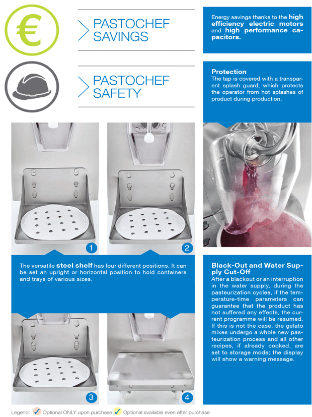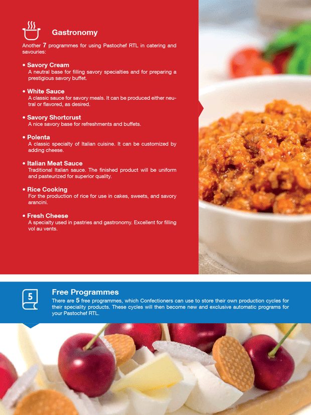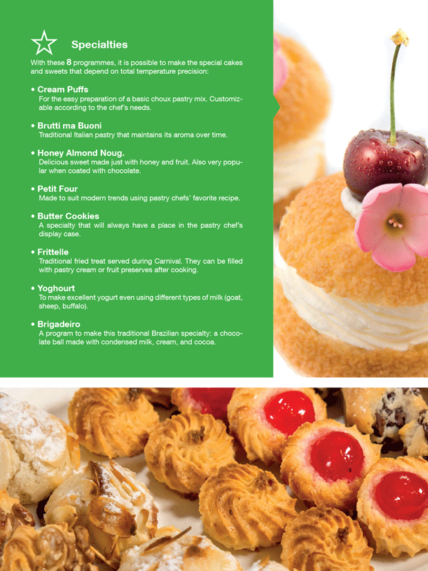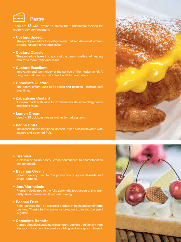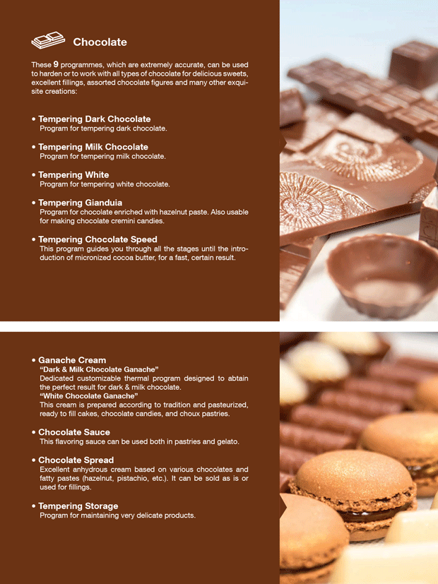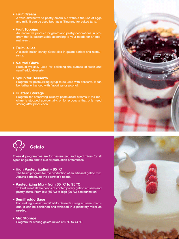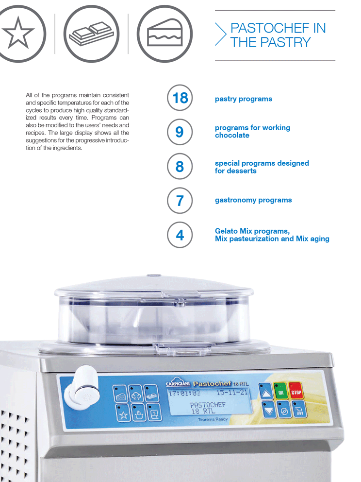 18 pastry programs, 9 programs for working chocolate, 8 special programs designed for desserts, 7 gastronomy programs, 4 Gelato Mix programs, Mix pasteurization and Mix aging