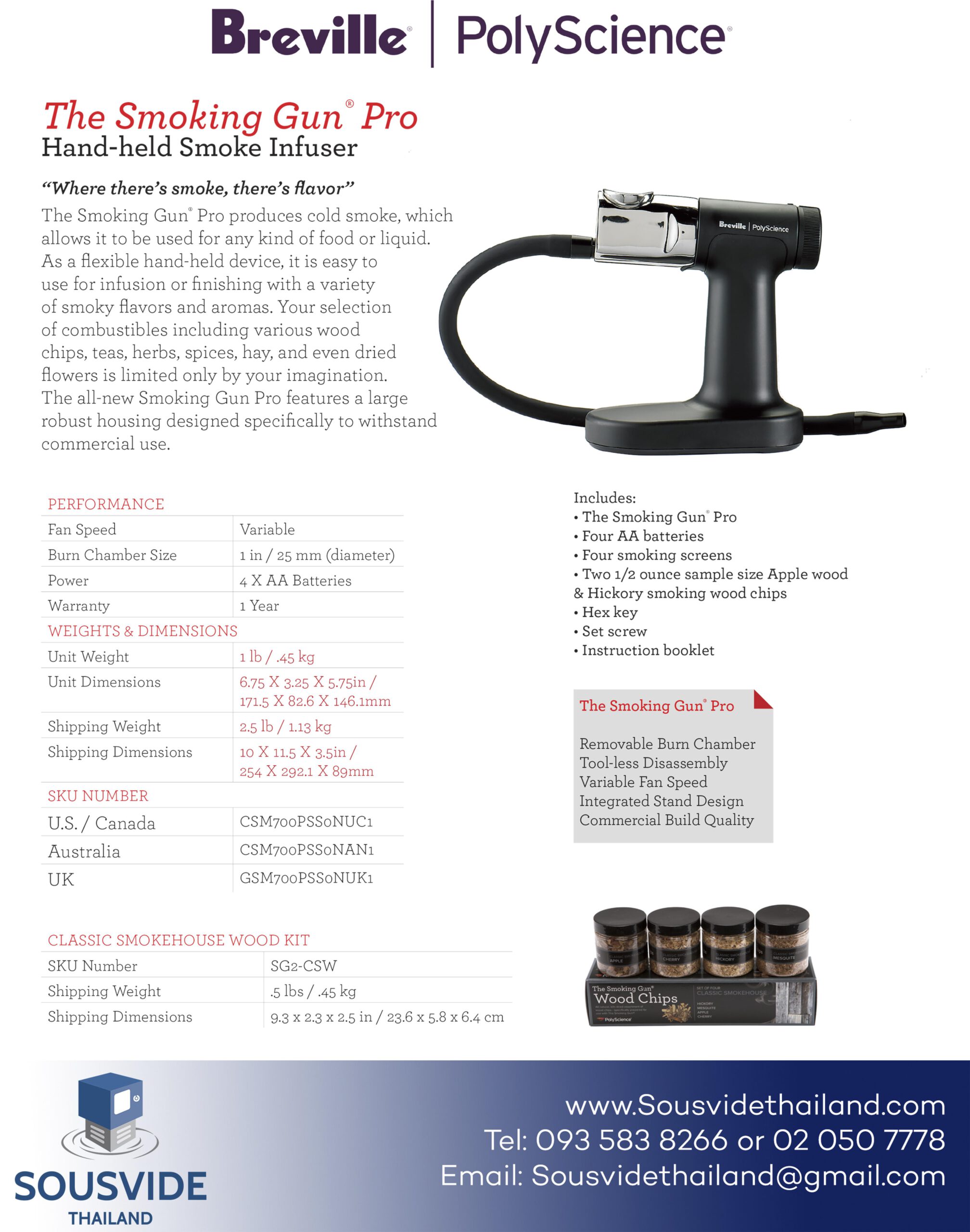 กลิ่นและรสชาติที่คุณกำลังจิตนาการ สามารถสร้างสรรค์ได้ด้วยเครื่องรมควัน The Smoking gun Pro ที่ใช้การรมควันแบบ Cold Smoke (ควันเย็น) ช่วยเพิ่มเอกลักษณ์เฉพาะตัวให้กับอาหาร สร้างมิติให้อาหารของคุณน่ารับประทานมากยิ่งขึ้น และเพลิดเพลินไปกับการรมควันอาหารจานโปรดของคุณ เครื่องรมควัน Smoking Gun ทำได้มากกว่าวิธีรมควันทั่วไป ไม่ว่าจะเป็น สลัด ช๊อคโกแลต เมอแรงค์ ซอส เนย ผลไม้ หรือแม้กระทั่ง เบียร์และค๊อกเทล ตัวเครื่องใช้ถ่าน Battery พกพาง่าย สามารถปรับระดับความแรงของควันได้ตามต้องการ สามารถเลือกวัตถุดิบได้หลากหลายตามใจชอบเช่น ไม้ฟืนรมควัน ใบชา สมุนไพรต่างๆ เครื่องเทศต่างๆ แม้แต่ดอกไม้แห้ง และอื่นๆตามความต้องการของคุณ